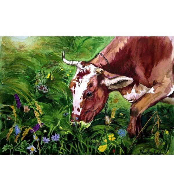 Cow Painting is Original 100% hand painted watercolor artwork one of a kind by Alina Sluchinska. This is not a copy or print or watercolor from photo art.