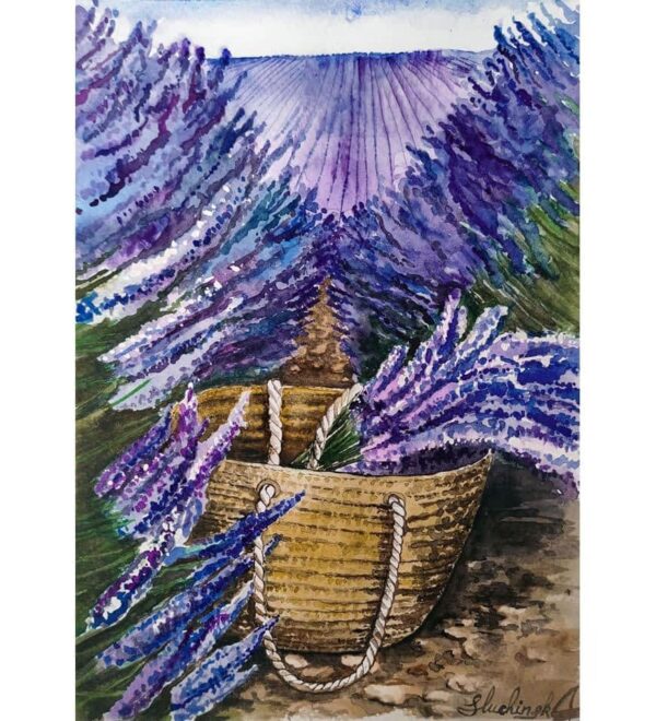 Italy Painting Lavender Field is Original 100% hand painted watercolor artwork one of a kind by Alina Sluchinska. This is not a copy or print or watercolor from photo art.